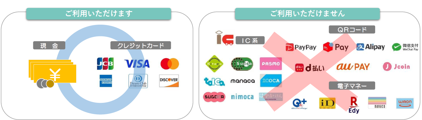 現金およびクレジットカードは引き続きご利用いただけます。