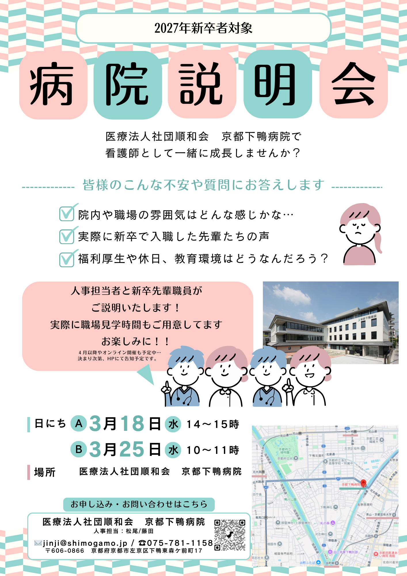 | お問合せ | 担当: 藤 田 Mail: jinji@shimogamo.jp TEL: 075-781-1158 |
