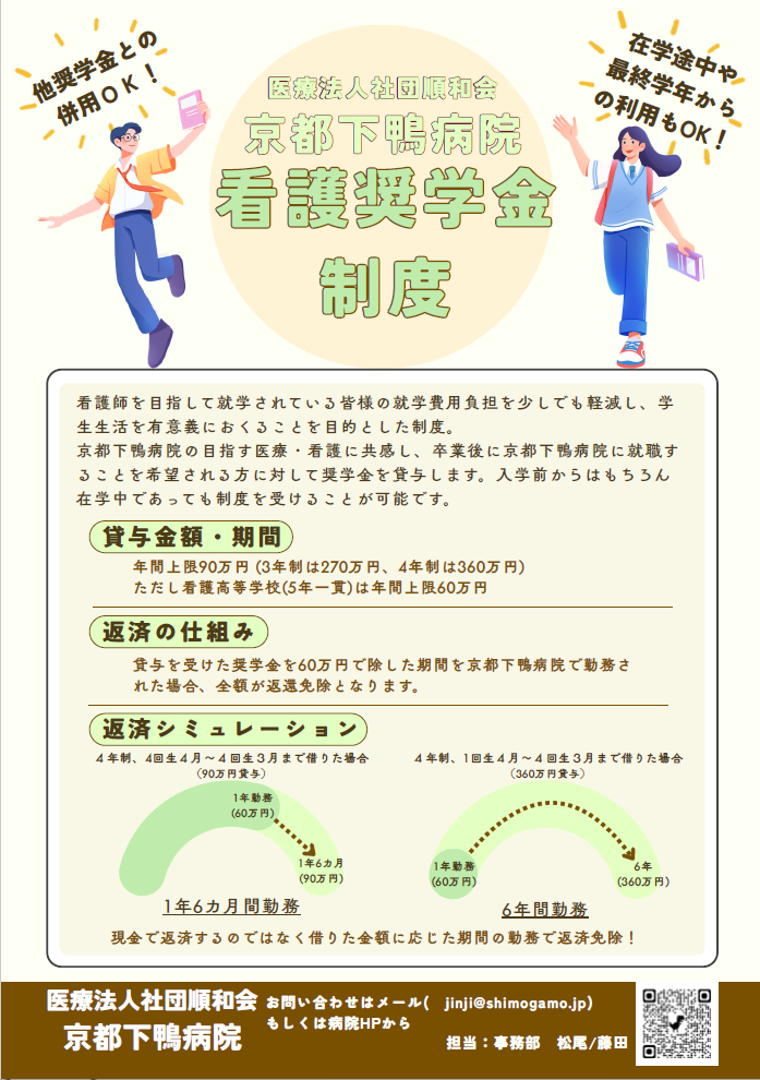 新1年生の皆さまはもちろん、在学中の方も京都下鴨病院の看護学生奨学金制度を活用いただけます。