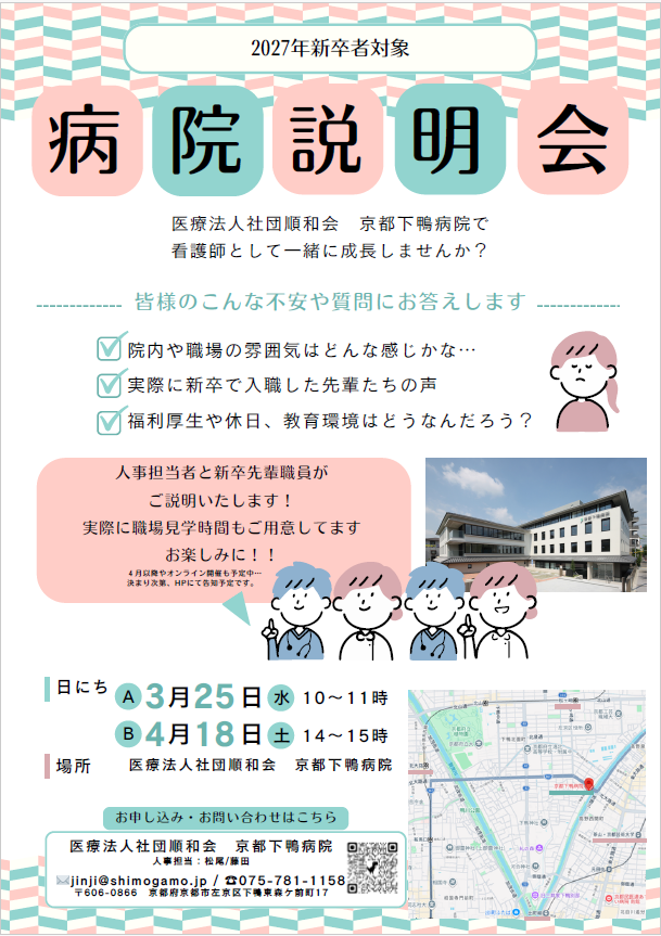 | お問合せ | 担当: 藤 田 Mail: jinji@shimogamo.jp TEL: 075-781-1158 |